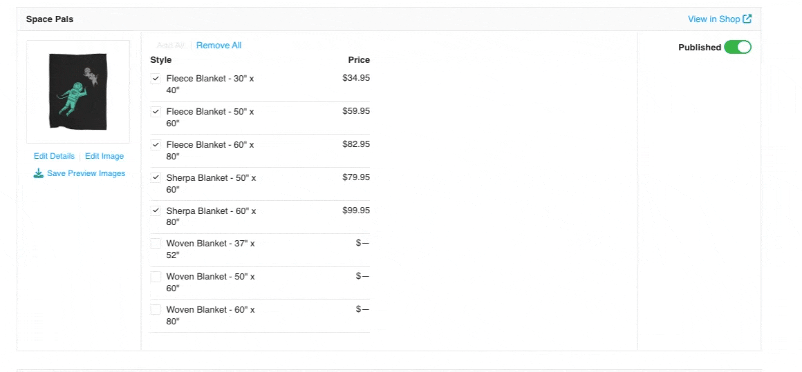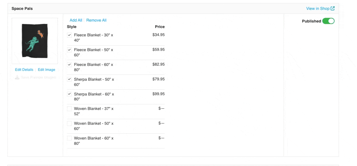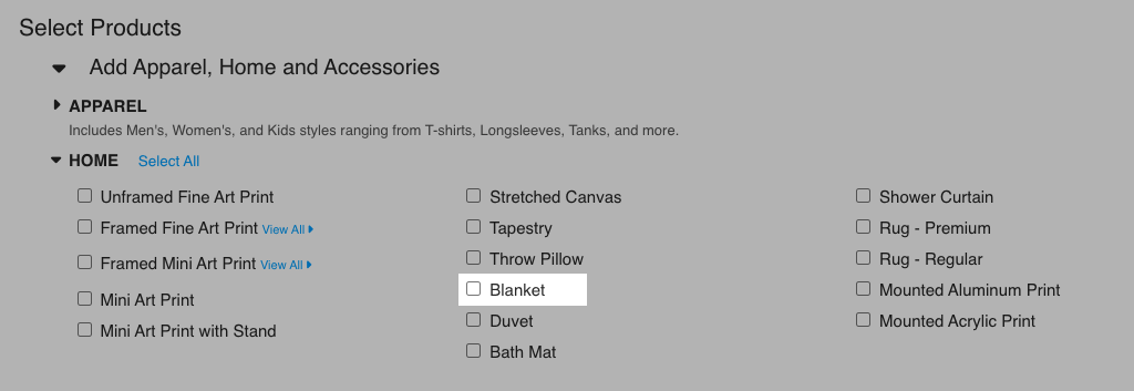 From the Manage Products page, filter by 'Home' and select 'Blankets' from the dropdown. You can add individual sizes by clicking on the checkbox of that blanket size (i.e., Woven Blanket - 60" x 80"). Clicking the checkbox again will remove that size.